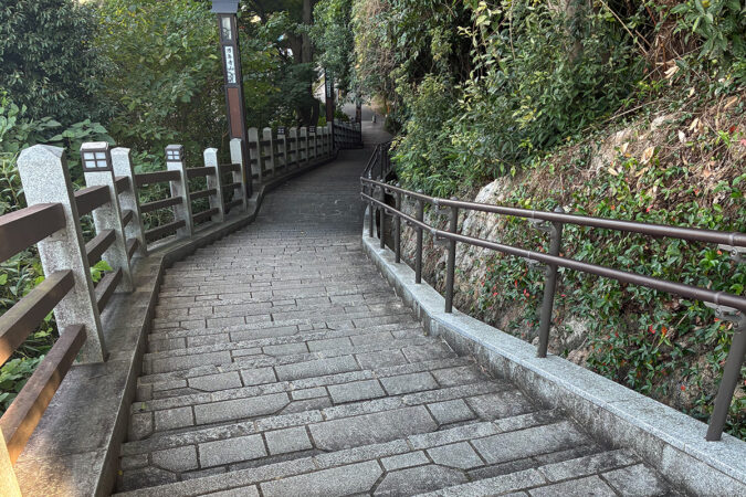 帰りは来た道を下らずに、右手の梅林を抜けます。しばらく進むと、補整された石造りの階段があります(写真左)。その階段を下りていくと枚方市駅が見えてきます。もしも方角に迷ったら、ピンク色のイオンの看板を目指すといいですよ(写真右)。