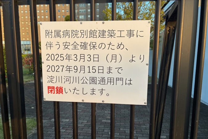 ビュースポット(淀川河川公園枚方エリア最上流の堤防)に行くには、関西医科大学と総合文化芸術センターの間を直進します。附属病院側からは入れません。病院裏の通用門は、工事のため2027年9月まで閉鎖中です。