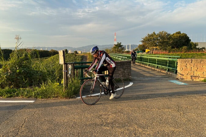 北河内サイクルラインを大阪市内方面へ2、3分歩くと、円形のベンチとトイレを配した休憩スペースが出現します。ベンチに座ってサイクルロードを見上げるアングルが、ちょうどいい感じの逆光なんです。エモい写真が撮れますよ!