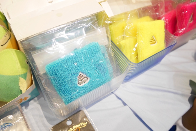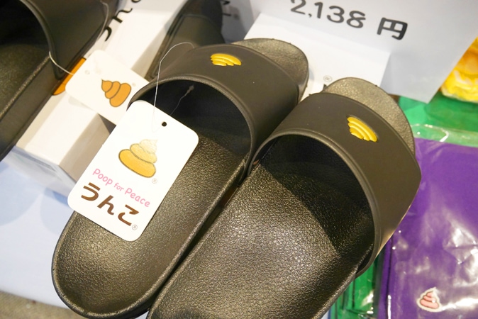 うんこが付いてる!?「うんこスリッパ(2,138円)」と、むしろカッコいいマークに見える「うんちリストバンド(各756円)」。