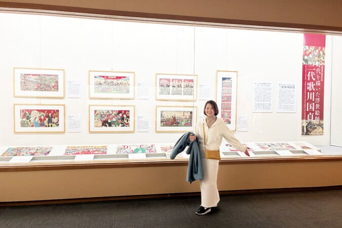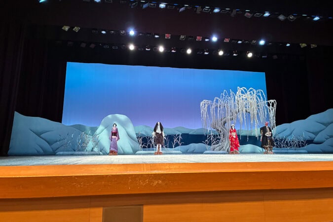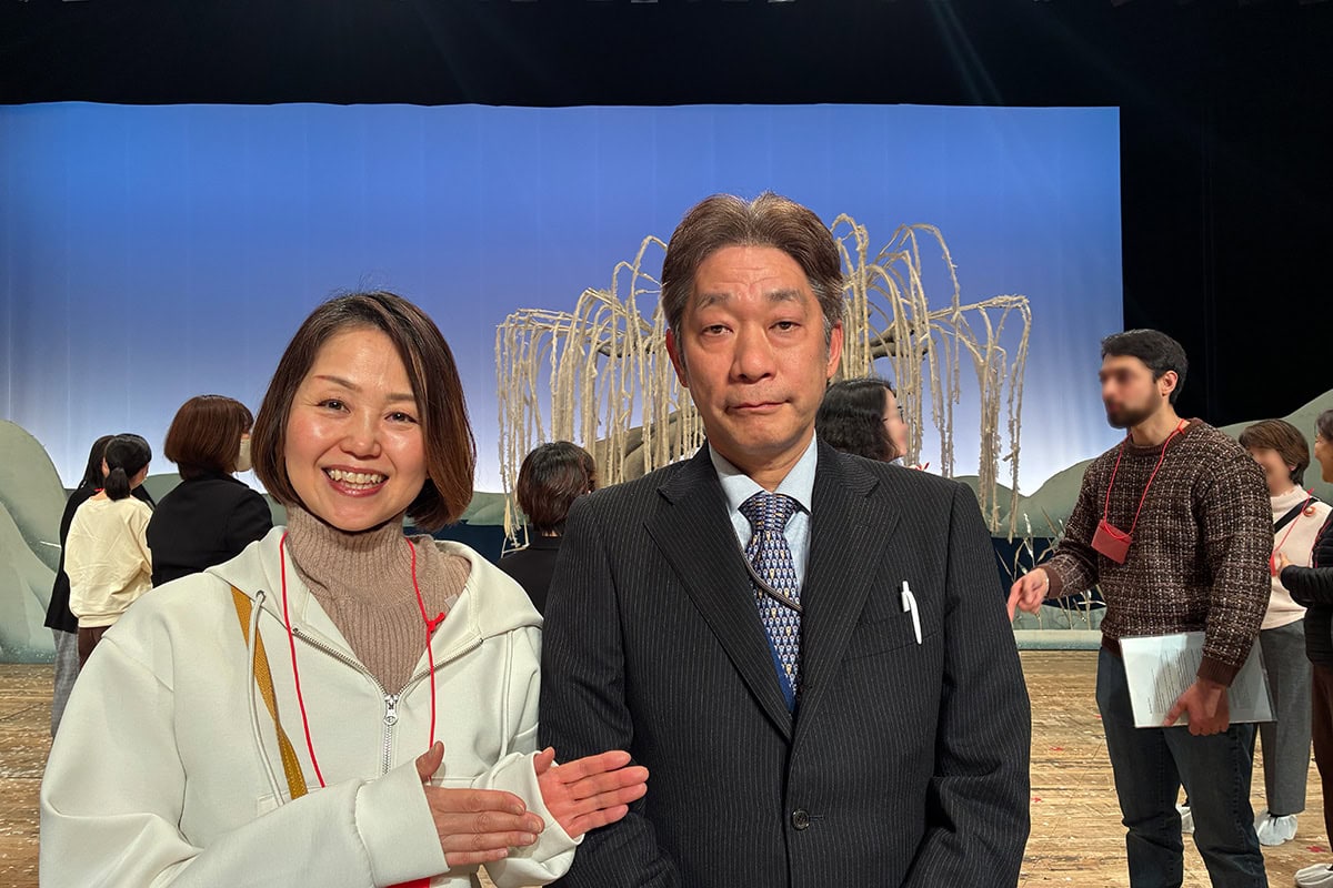2026年2月に参加したバックステージツアーで、普段は立ち入れない舞台の真ん中に立たせてもらいました。背後の白い柳は「鷺娘」の舞台セットです。