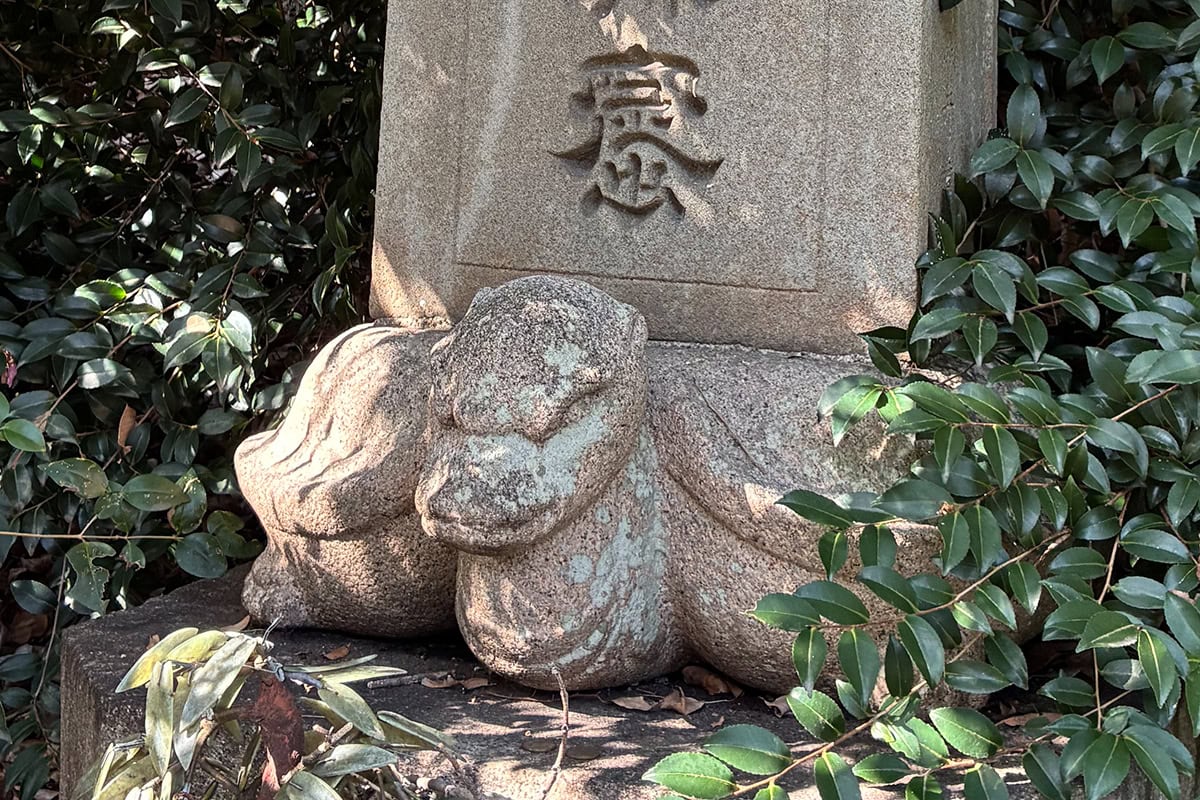 中国の伝説上の生きもの「贔屓(ひいき)」は、重いものを背負って支えることを好むそうです。歌舞伎の世界では、支援者を「ご贔屓筋」と呼びますが、この霊獣が由来だとか。贔屓は、境内の「八島君之廟窟碑(やしまきみのびょうくつひ)」の足元にいるので、ぜひ探してみてください。