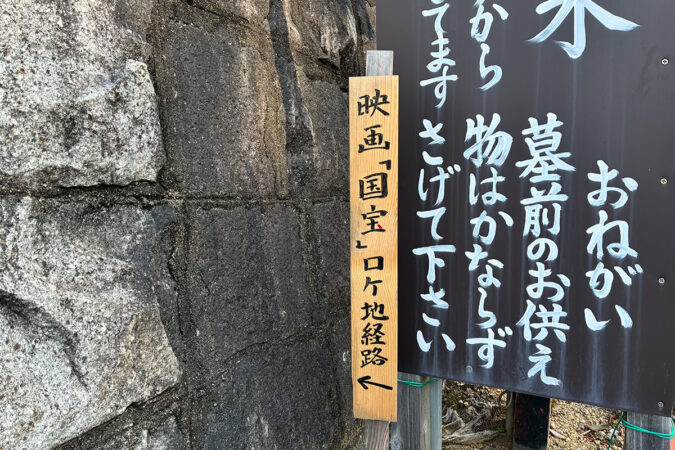映画「国宝」には、四代目・中村鴈治郎さんが出演・歌舞伎指導をされています。その曾祖父にあたる初代・中村鴈治郎は、大正期に楠木正行を演じた縁で、往生院六萬寺に石段や石碑を寄進しています。約110年の時を経て、再び縁がつながったことになりますね。
