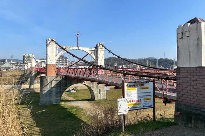 藤井寺市道明寺と柏原市石川町をつなぐ、全長151mの玉手橋。2001年に吊り橋として全国初の登録有形文化財に指定された、貴重な建造物です。昭和初期らしい重厚感がとても素敵でした!