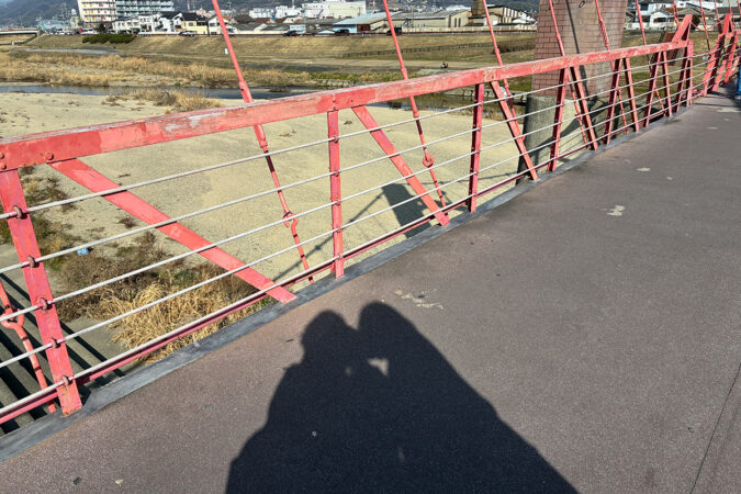 映画では、この橋の上で、俊介が喜久雄の胸ぐらをつかみます。(写真は胸ぐらをつかむイメージを影で再現したものです。)