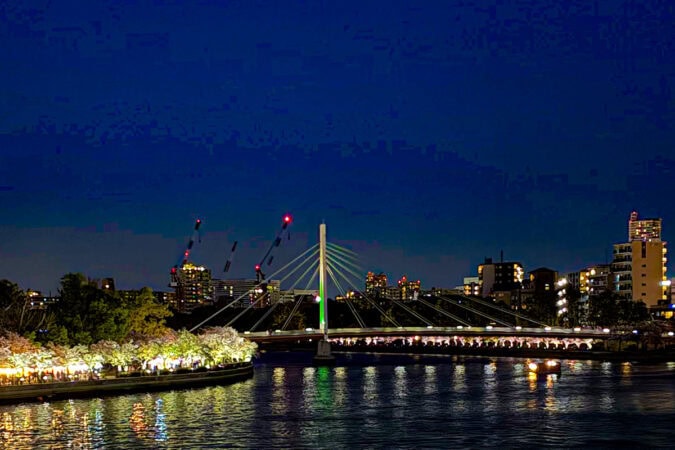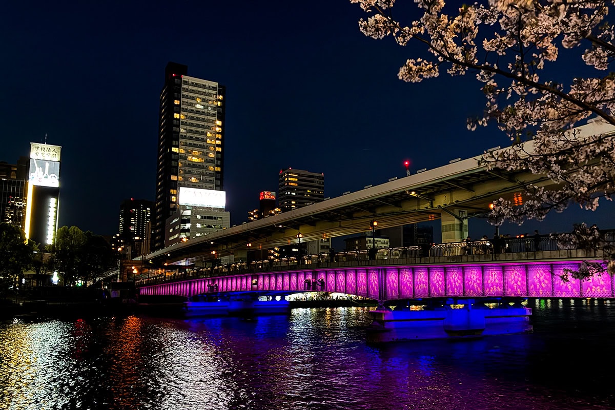 日が暮れるとライトアップされ、夜の大川にアーチがやわらかく浮かび上がります。