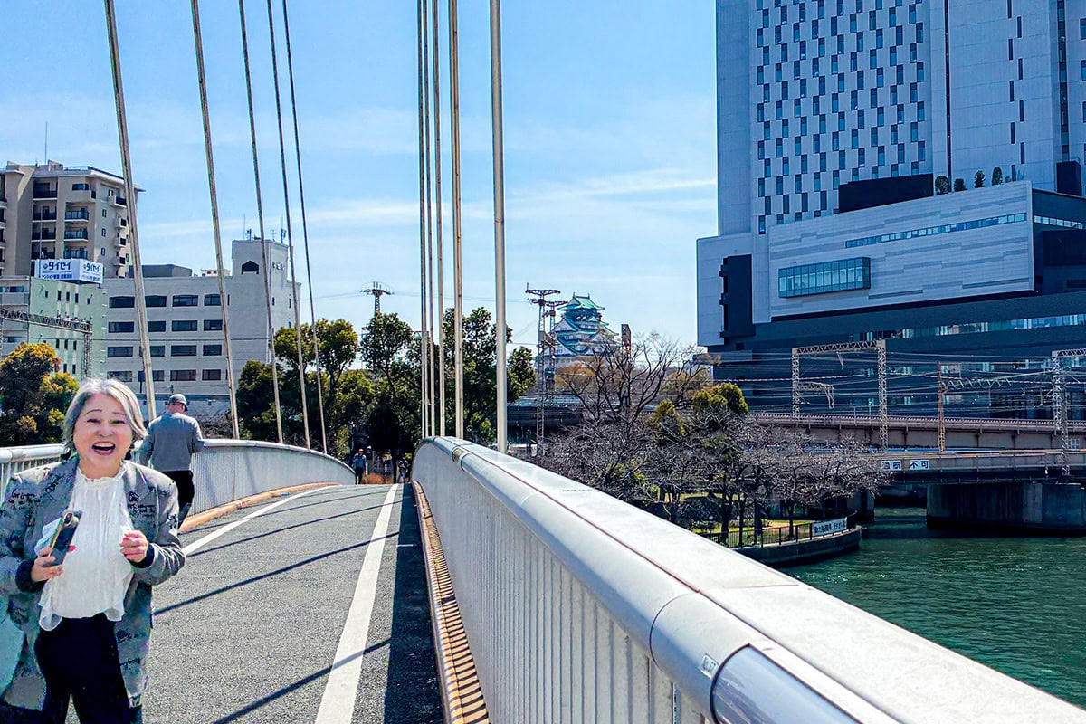 橋の上は開放感たっぷりの360度パノラマ。東にOBP、西に都心部、南に天守閣を望みます。