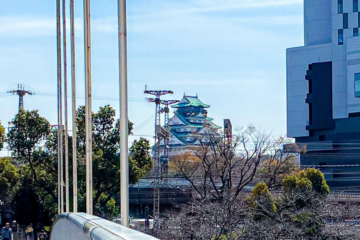 右岸側から対岸(左岸)へ向くと、大阪城が肉眼ではっきり見えます。(レンズ越しでは拡大必須。)