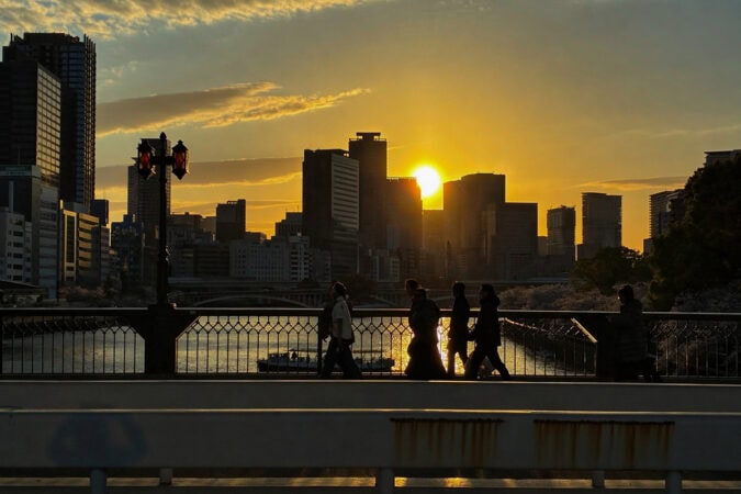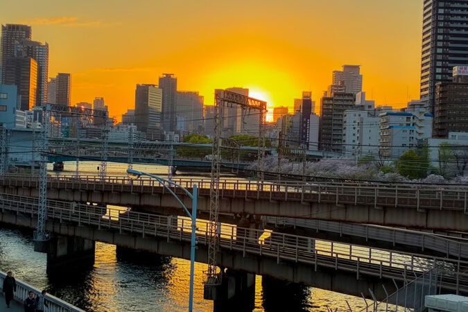 橋の上からは、行き交う人のシルエットと高層ビル群に沈む夕日が重なります。