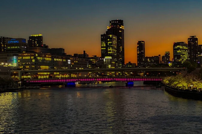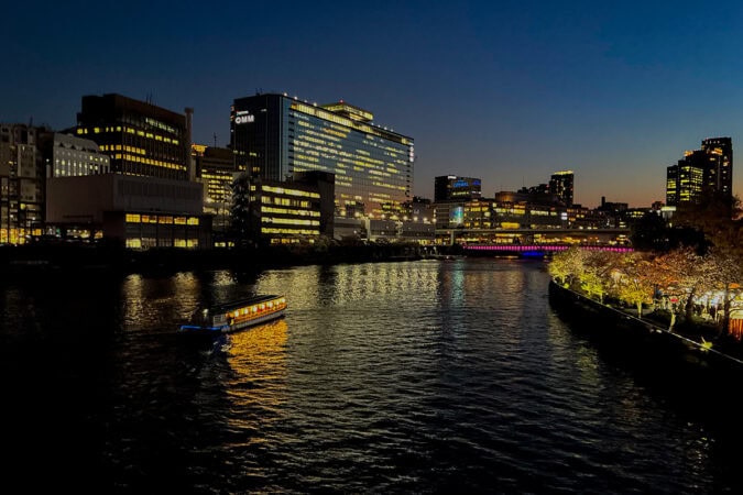 川のラインとビル群がきれいに整い、夜は光のグラデーションを広く美しく写せます。
