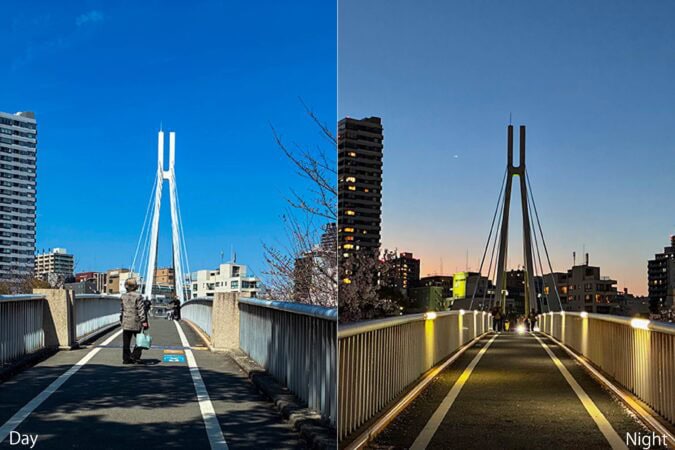 同じ場所から再撮影しました。時間によって、橋の印象が大きく変わります。