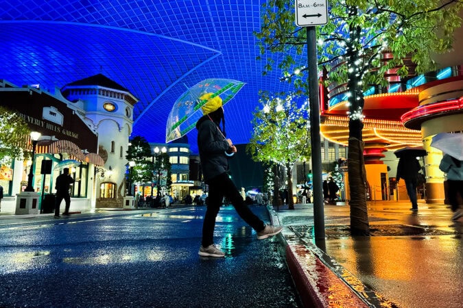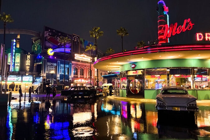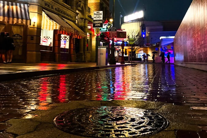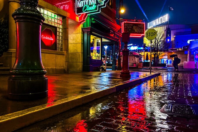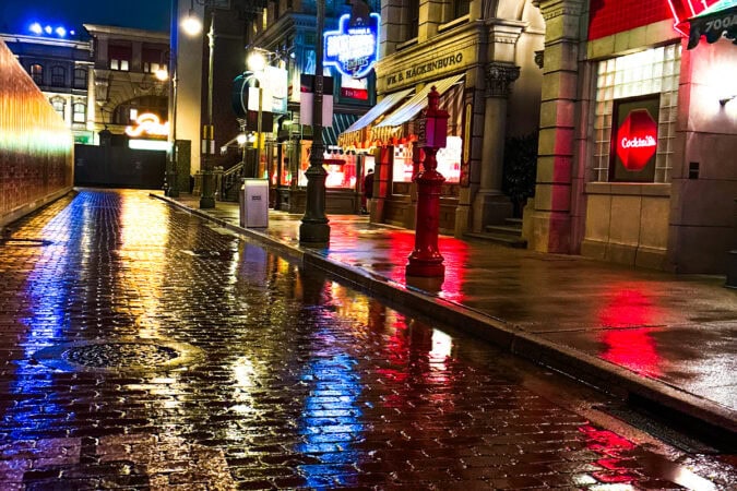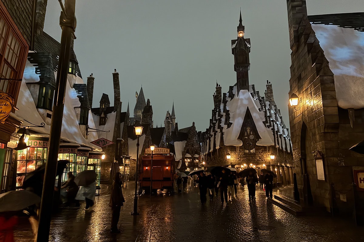 薄暮のハリーポッターエリアから、ネオンが輝くニューヨークエリアまで、時間とともに変わる景色も楽しみのひとつ。さらに、比較的空いていることや、雨ならではの写真が撮れるのも魅力です。