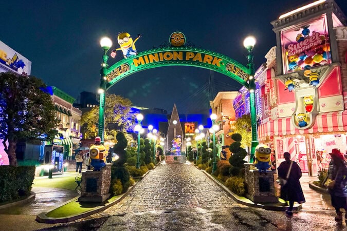 ミニオンパーク周辺は、カラフルなライトアップが印象的。夜になるとアーチが明るく光り、このエリア特有のポップなカラーがより鮮やかに際立ちます。