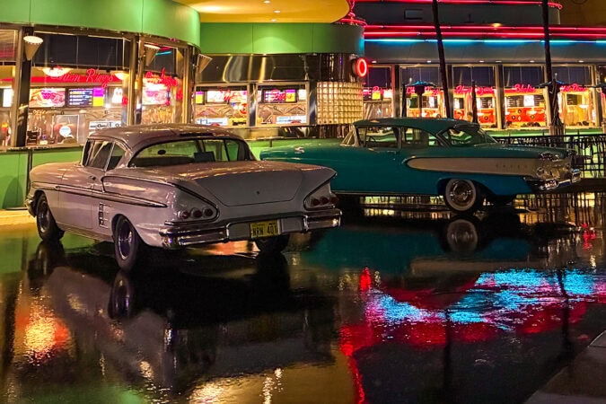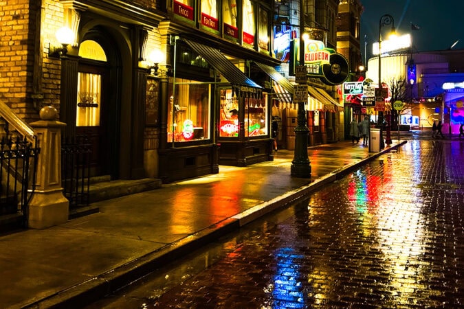 雨の日の日没後に、もっとも写真映えするのがニューヨークエリアです。ネオンの光が濡れた路面に反射して、まるで本場ブロードウェイのよう。