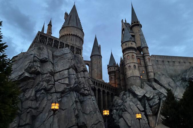 薄暮(日没前後1時間)のハリーポッターエリアは、もっともファンタジーな雰囲気が高まる時間帯です。うす暗い中でライトアップが始まり、ホグワーツ城がより立体的に浮かび上がります。