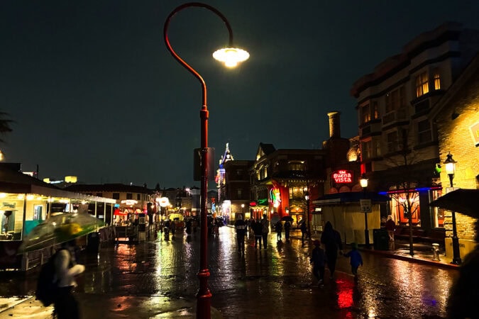 港町を再現したサンフランシスコエリアは、水辺の景色が広がる落ち着いたエリア。雨打つ水面に光がゆらめいて、静かで大人っぽい雰囲気になります。