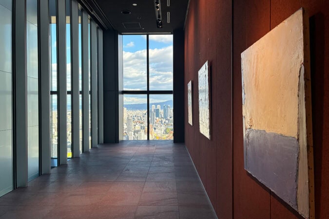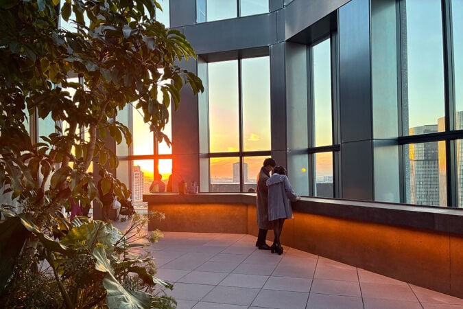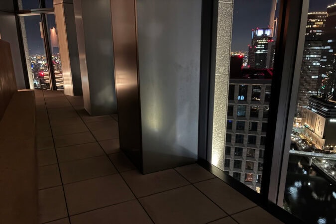 地上約150m、都会の空に開かれたテラス。足元から伸びる2層吹き抜けのロングガラスとメタルフレームが、土佐堀川とビル群をそのまま額装。極上のアートのように映してくれます。