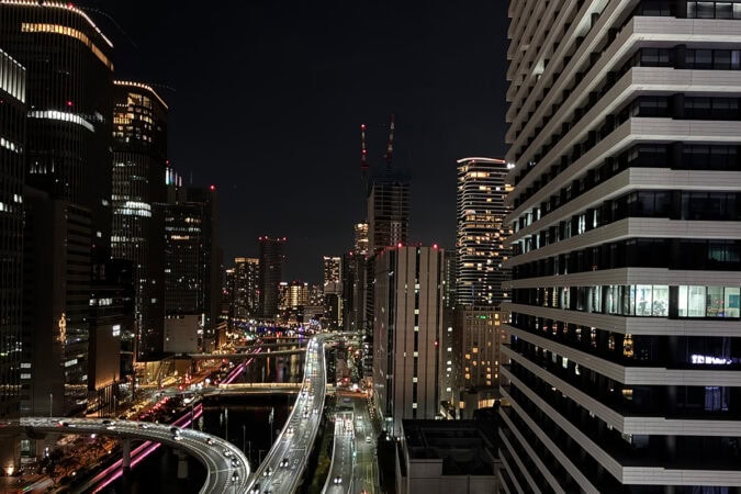 夜の景色はさらにダイナミックです。護岸ライトに車のヘッドライトが重なって、都心ならではのスピード感が伝わってきますね。