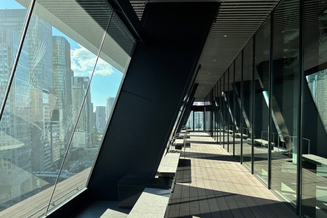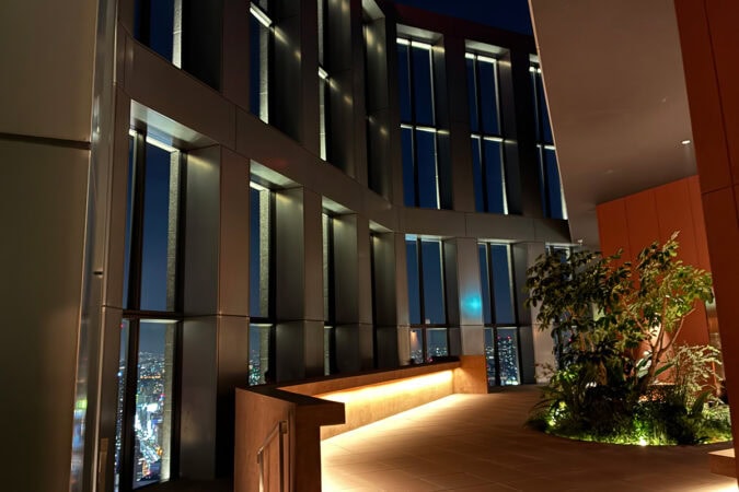 垂直に伸びるガラス壁とメタルのフレームが光を反射して、テラス全体が巨大なランタンのようでした。