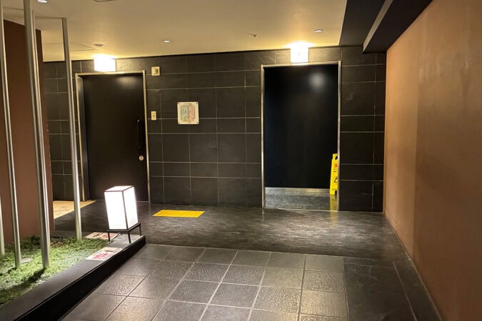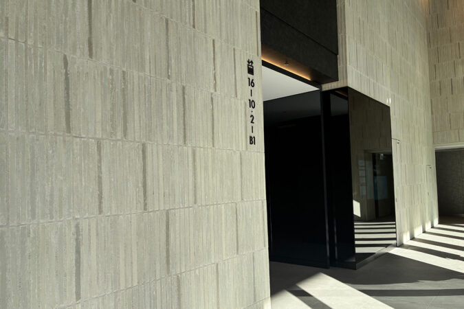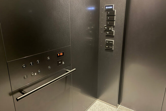 ムダのない美しいエレベーターホールですが、一方で案内表示が少なく、オフィス階にも止まるため、初見だと少し迷いやすい印象です。