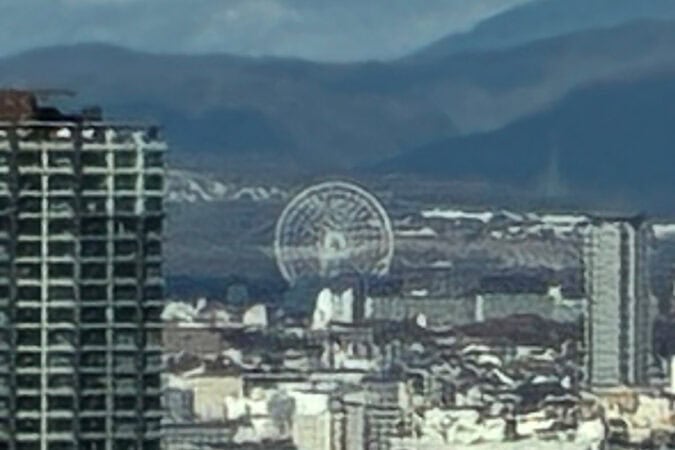 山のふもとにズームすると、エキスポシティの観覧車が見えましたよ。
