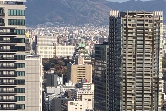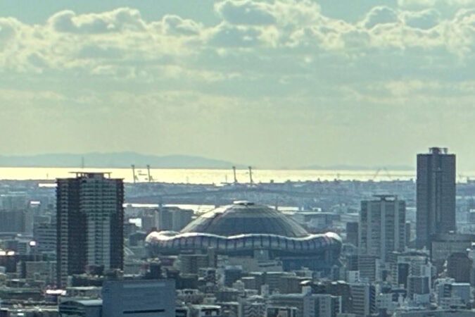 拡大すると京セラドームが見えます。その奥にうっすら浮かぶ山のようなシルエットが淡路島です。さすがは高層階、スケールが大きいですね。