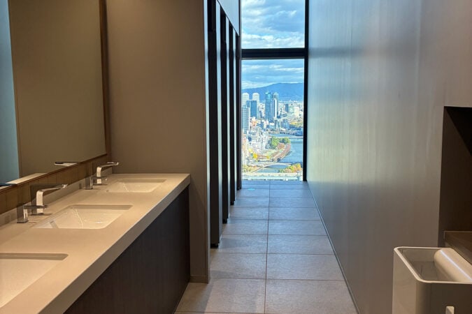 エレベーターホールを挟んだ反対側には、女子トイレがあります。ホテルのようにシックで美しいデザイン。しかも眺望付き。清掃が行き届き、便座除菌クリーナーもあって、申し分ありません。