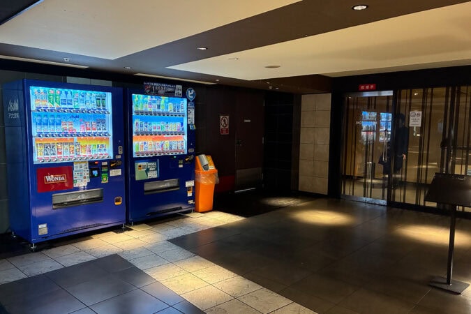 展望エリア近くの自動販売機。飲み物片手に、景色を楽しめますね。突き当たり(写真右)には喫煙所も。