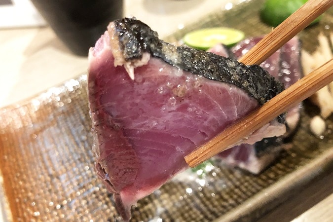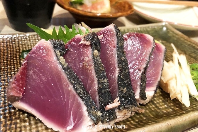 皮の焼き色もとっても美味しそうな「カツオ塩たたき 880円」。美味しそうな脂が輝いていますね♪キュッと引き締まった身をひとくちかじると程よい塩味が広がり、ビールの苦味とあわさって衝撃的なベストマッチ!