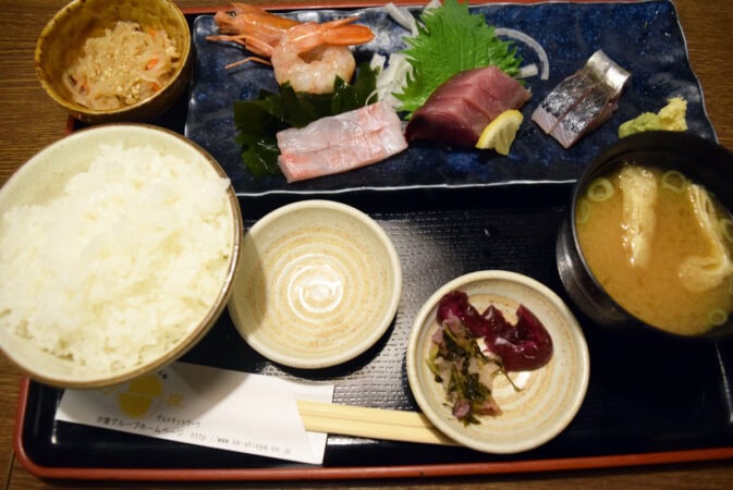 日によって変わるマグロなどの4種類の刺身が盛り合わせになった数量限定の豪華な定食です。