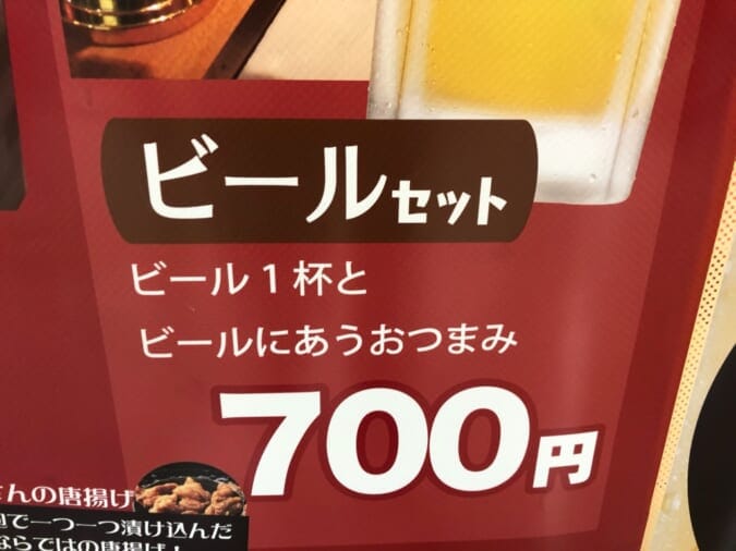 (※2023年4月時点では「枝豆&ポテサラ」または「唐揚げ2個」付きです)
