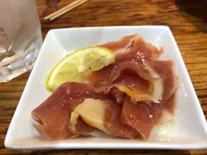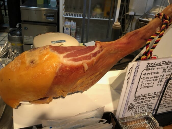 「生ハム切りたて一皿 490円(税抜)」は、目の前で生ハム原木をカットしていいただけます!